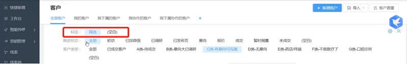 “你看,这个销售跟进的客户有四五千家,虽然已经根据意向度高低进行了ABC分类,但每一类型中客户情况又千差万别,比如客户所在区域、对接医院的类型、是否需要近期密集跟进等等。销售人员不懂如何在系统里给这些客户打精细化的标签,方便后续快速筛选。”上述负责人说道。