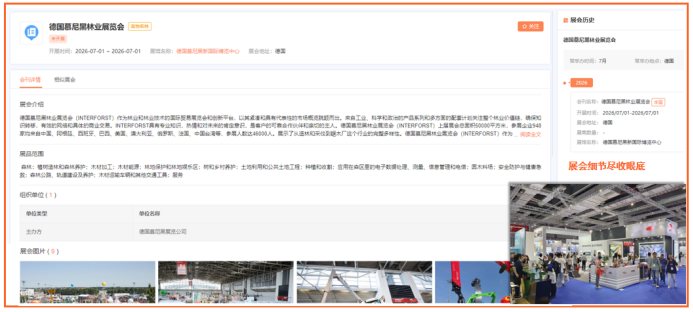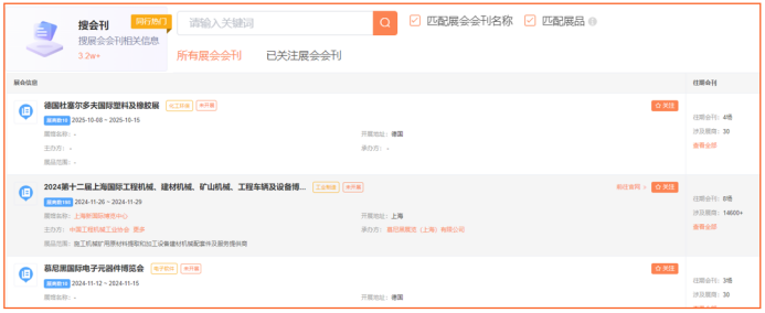 通过【搜会刊】,你可以详细了解展会的主办/承办方、展品范围、展会地址、展商数量、举办时间,往期会刊及涉及的展商以及参展数据;你可以一键查询会刊官网,还能根据已搜索展会属性,找到相似展会。