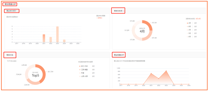 【展会画像分析】提供展会举办频次、常举办时间、常举办地等,多维度数据统计,直观洞察展会趋势。