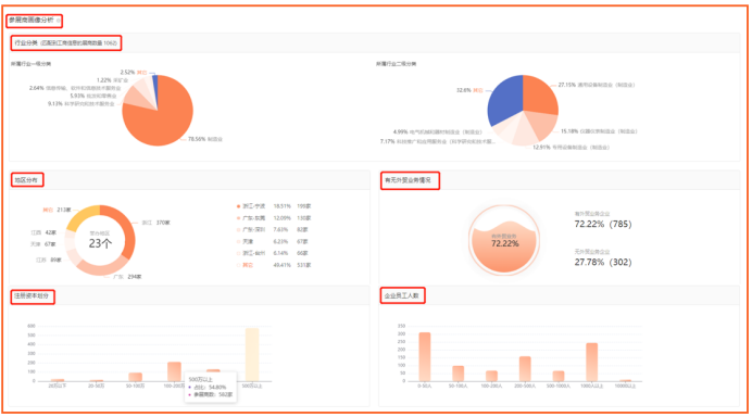 【参展商画像分析】行业分类、地区分布、有无外贸情况、注册资本划分、企业员工人数,精准定位目标数据,深入了解参展商情况。