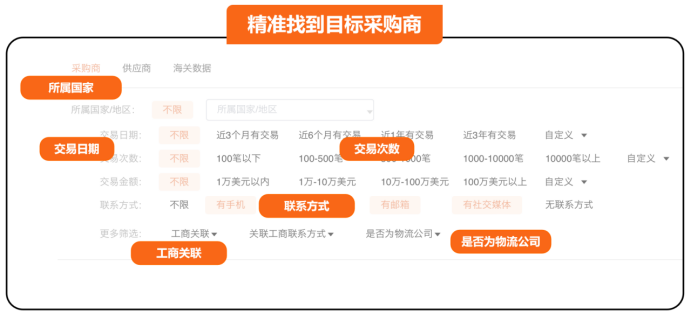 假如你是生产LED灯的,想找海外客户,点击【采购商】,输入LED,通过“所属国家”、“交易日期”、“交易次数”、“交易金额”、“联系方式”等精准查询目标数据。