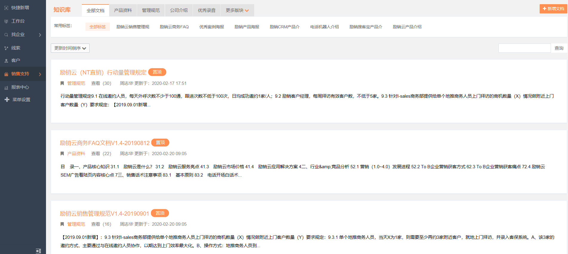 在文化管理这一环节,主要分为两个方面。一方面是增加品牌的对外曝光度,让目标客户对品牌有个好印象;另一方面是利用励销CRM中的【知识库】功能,加强企业背景、产品信息、相关技术的内部宣导,让一线销售人员充分了解自身品牌的优势和亮点,从而能更好地开展营销工作。
