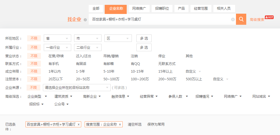 在经过与目标客户的特性比对后,他拟定了百世家具,橱柜,衣柜,学习桌灯字段作为常用关键词,并得意地告诉我们使用这些字段还能二次提升找客精准度,目前,通过这些字段获取的客户线索已有1200+,其中有30+已确定是意向客户,等待进一步跟进。