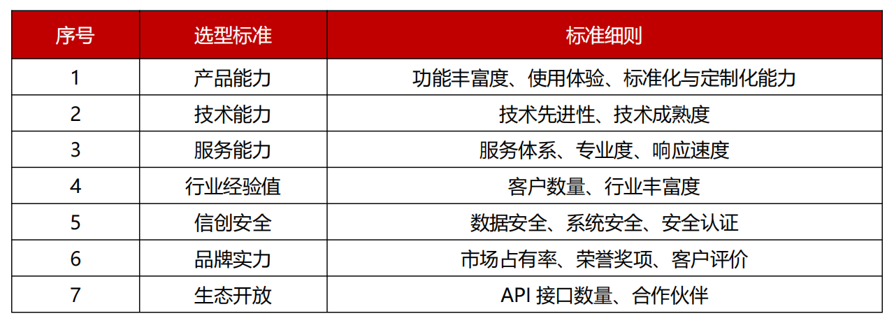 为助力行业可持续发展,ToBUP研究院走访调研多家行业内头部企业,给出了B2B营销SaaS行业通行选型标准,衡量维度主要包括:产品能力、技术能力、服务能力、信创安全、行业经验、品牌实力、生态开放7大维度。